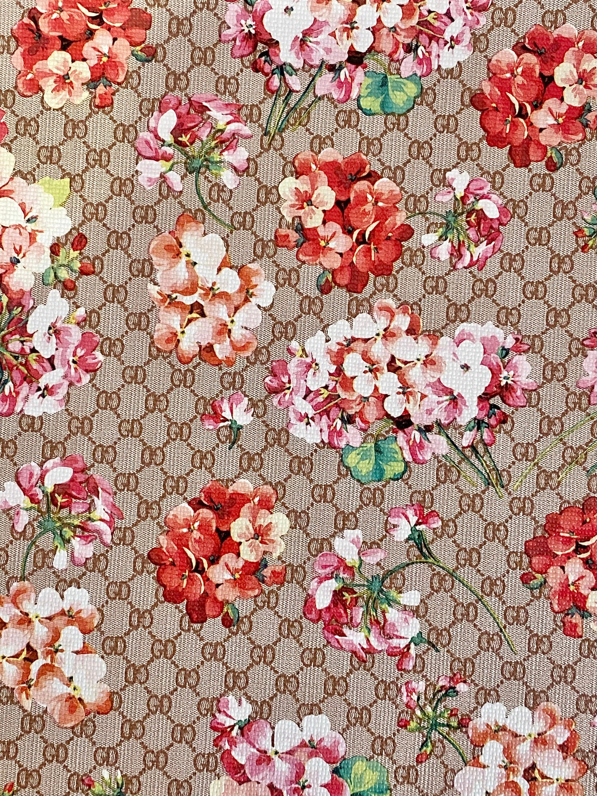 Cute Flowers on Tan faux leather. The background is a tan/light brown color with a flower and letter print on it.The flower print is white, pink and red. The back if a soft felt like material.
