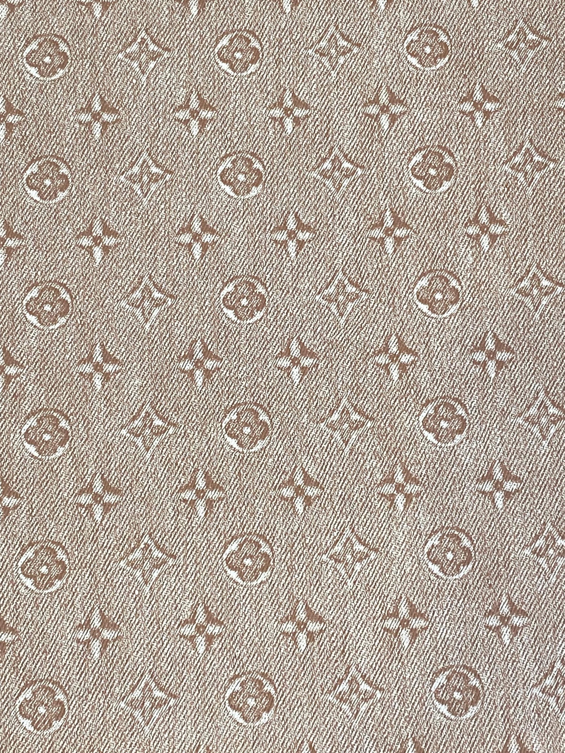 This faux leather has a faded light brown print on it. The back of the faux leather is a soft, felt fabric.
