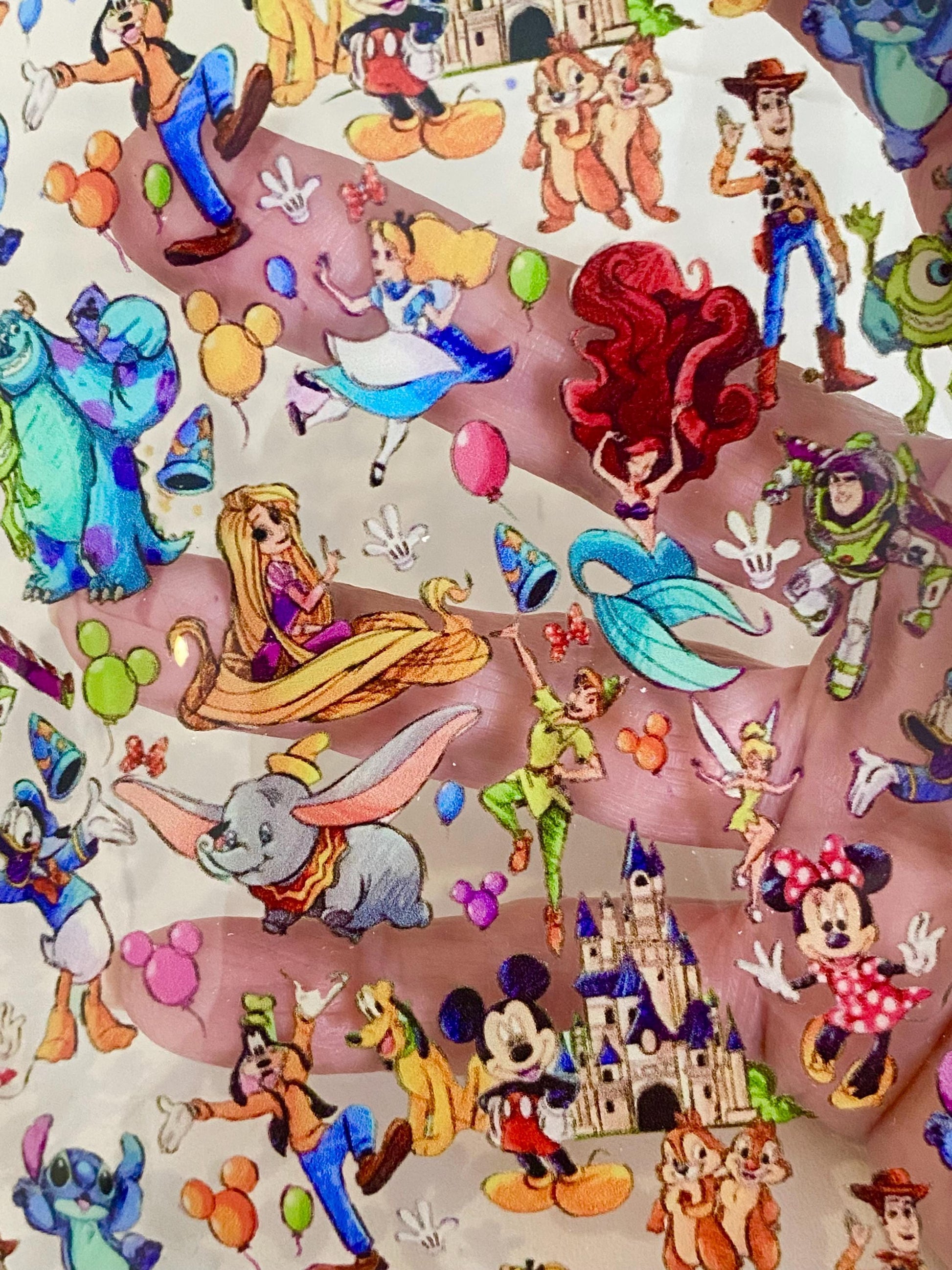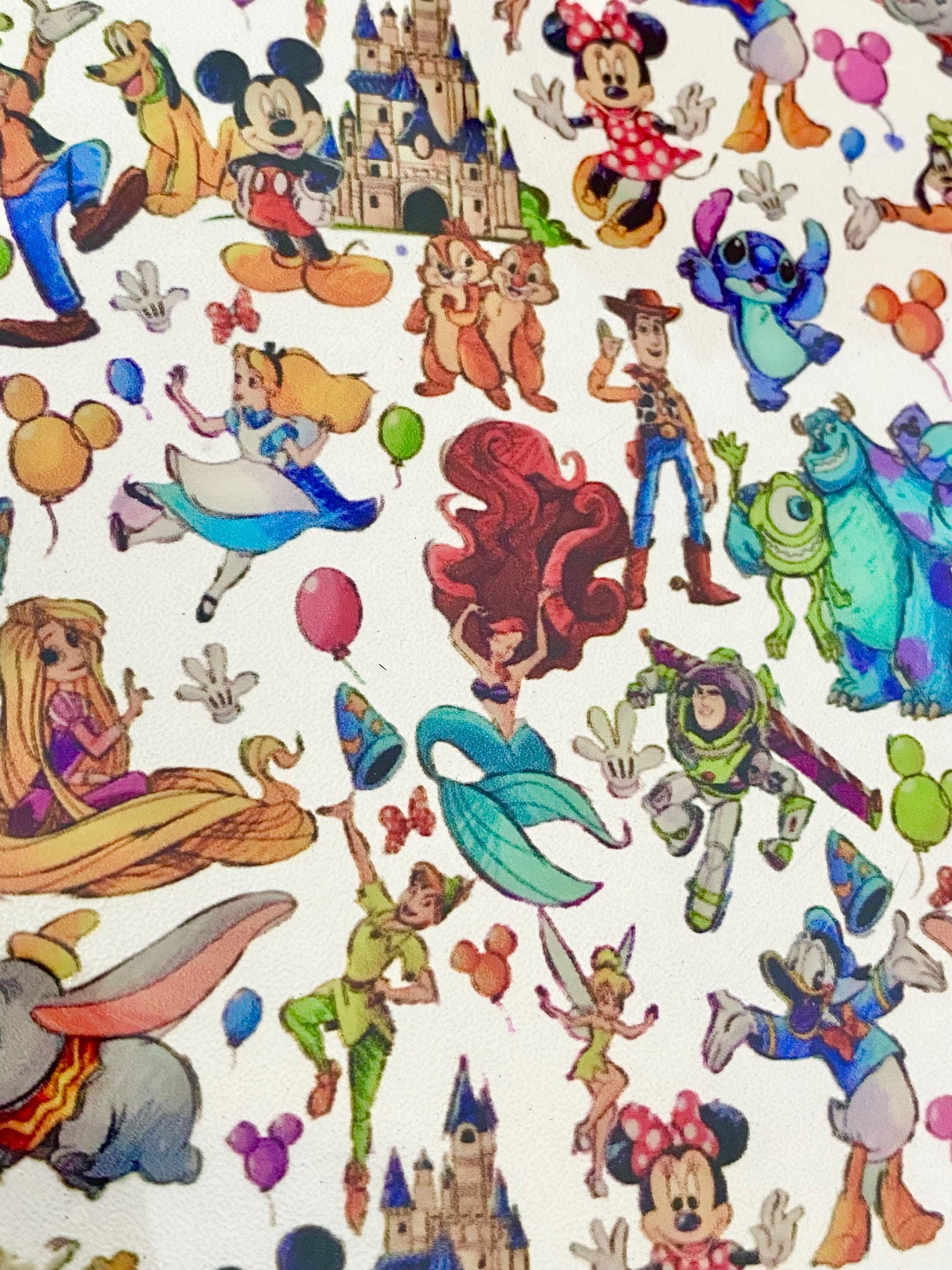 This Jelly faux leather, is Happy Characters! It is a transparent jelly vinyl with all the favorite characters from one of the happiest places..you know the place. The print goes from top to bottom of the sheet; not side to side.